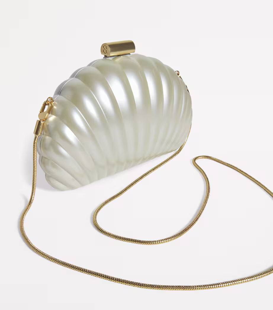 With its sculptural shell shape and pearlescent finish, the Simkhai Monet Clutch embodies elegance in motion. Designed for soirées that stretch into midnight, it’s the perfect companion for evening glamour and resort celebrations.